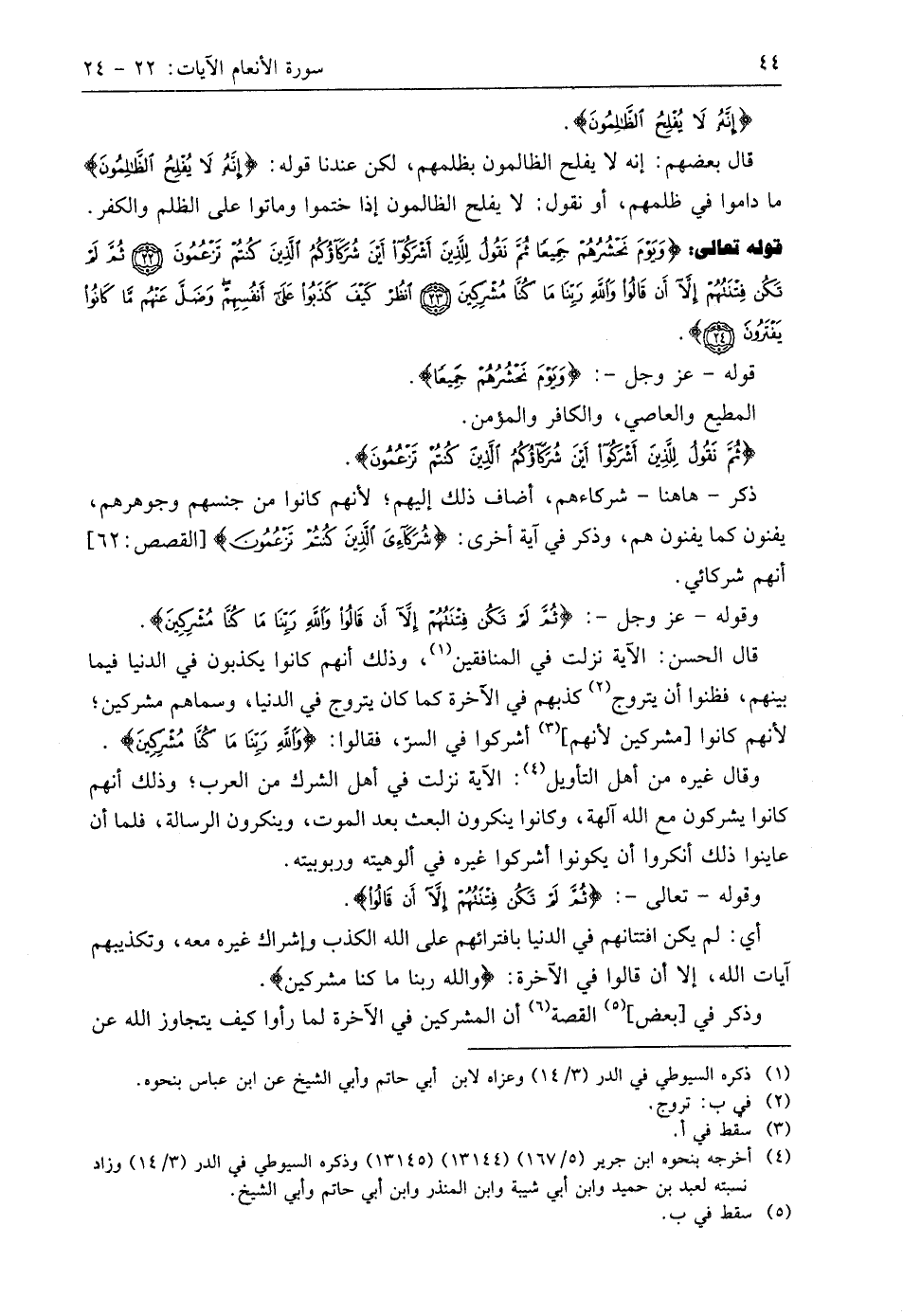 قوله تعالى: (وَيَوْمَ نَحْشُرُهُمْ جَمِيعًا ثُمَّ نَقُولُ لِلَّذِينَ أَشْرَكُوا أَيْنَ شُرَكَاؤُكُمُ الَّذِينَ كُنْتُمْ تَزْعُمُونَ (22) ثُمَّ لَمْ تَكُنْ فِتْنَتُهُمْ إِلَّا أَنْ قَالُوا وَاللَّهِ رَبِّنَا مَا كُنَّا مُشْرِكِينَ (23) انْظُرْ كَيْفَ كَذَبُوا عَلَى أَنْفُسِهِمْ وَضَلَّ عَنْهُمْ مَا كَانُوا يَفْتَرُونَ (24)