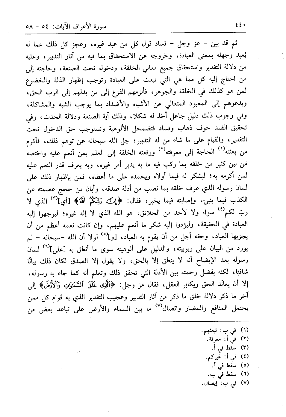 ثم قد بين - عَزَّ وَجَلَّ - فساد قول كل من عبد غيره، وعجز كل ذلك عما له يُعبد وجهله بمعنى العبادة، وخروجه عن الاستحقاق بما فيه من آثار التدبير، وعليه من دلالة التقدير واستحقاق جميع معاني الخلقة، ودخوله تحت الصنعة، وحاجته إلى من احتاج إليه كل مما هي التي تبعث على العبادة وتوجب إظهار الذلة والخضوع لمن هو كذلك في الخلقة والجوهر، فألزمهم الفزع إلى من يدلهم إلى الرب الحق، ويدعوهم إلى المعبود المتعالي عن الأشباه والأضداد بما يوجب الشبه والمشاكلة، وفي وجوب ذلك دليل جاعل أخذ له شكلا، وذلك آية الصنعة ودلالة الحدث، وفي تحقيق الضد خوف ذهاب وفساد فتضمحل الألوهية وتستوجب حق الدخول تحت التقدير، والقيام على ما شاء من له التدبير؛ جل اللَّه سبحانه عن توهم ذلك، فأكرم من بعثته الحاجة إلى معرفته ورفعته الخلقة إلى العلم بمن أنعم عليه واختصه من بين كثير من خلقه بما ركب فيه ما به يدبر أمر غيره، وبه يعرف قدر النعم عليه لمن أكرمه به؛ ليشكر له فيما أولاه ويحمده على ما أعطاه، فمن بإظهار ذلك على لسان رسوله الذي عرف خلقه بما نصب من أدلة صدقه، وأبان من حجج عصمته عن الكذب فيما ينبئ، وإصابته فيما يخبر، فقال: (إِنَّ رَبَّكُمُ اللَّهُ) أي، الذي لا ربَّ لكم سواه ولا لأحد من الخلائق، هو اللَّه الذي لا إله غيره؛ ليوجهوا إليه العبادة في الحقيقة، وليؤدوا إليه شكر ما أنعم عليهم، وإن كانت نعمه أعظم من أن يجزيها العباد، وحقه أجل من أن يقوم به العباد، ولولا أن اللَّه - سبحانه - لم يورد من البيان على ربوبيته، والدليل على ألوهيته سوى ما أنطق به على لسان رسوله بعد الإيضاح أنه لا ينطق إلا بالحق، ولا يقول إلا الصدق لكان ذلك بيانًا شافيًا، لكنه بفضل رحمته بين الأدلة التي تحقق ذلك وتعلم أنه كما جاء به رسوله، إلا أن يعانَد الحق ويكابَر العقل، فقال عَزَّ وَجَلَّ: (الَّذِي خَلَقَ السَّمَاوَاتِ وَالْأَرْضَ) إلى آخر ما ذكر دلالة خلق ما ذكر من آثار التدبير وعجيب التقدير الذي به قوام كل ممن يحتمل المنافع والمضار واتصال ما بين السماء والأرض على تباعد بعض من
