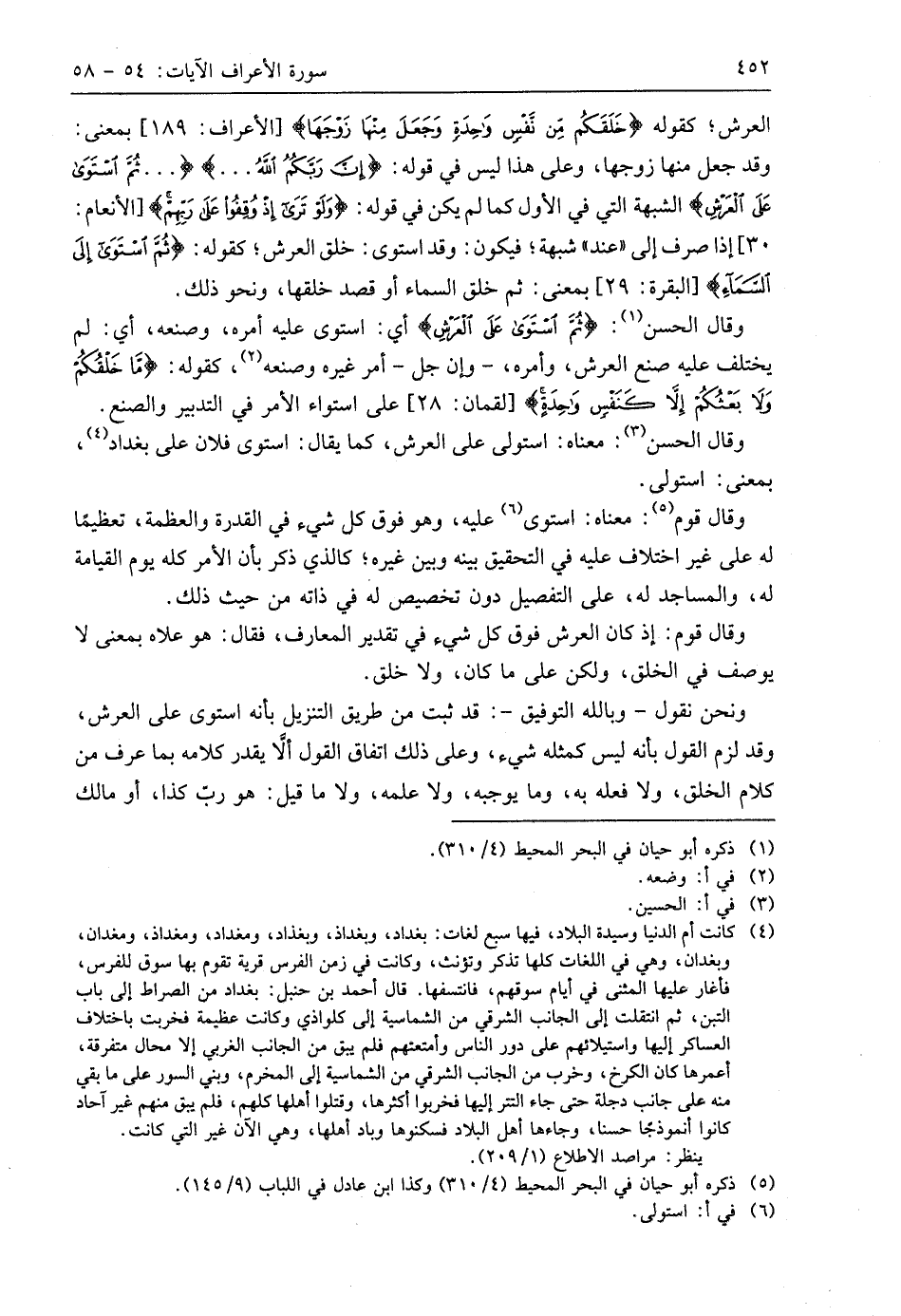 العرش؛ كقوله (هُوَ الَّذِي خَلَقَكُمْ مِنْ نَفْسٍ وَاحِدَةٍ وَجَعَلَ مِنْهَا زَوْجَهَا) بمعنى: وقد جعل منها زوجها، وعلى هذا ليس في قوله: (إِنَّ رَبَّكُمُ اللَّهُ. . .) (. . . ثُمَّ اسْتَوَى عَلَى الْعَرْشِ) الشبهة التي في الأول كما لم يكن في قوله: (وَلَوْ تَرَى إِذْ وُقِفُوا عَلَى رَبِّهِمْ) إذا صرف إلى " عند " شبهة؛ فيكون: وقد استوى: خلق العرش؛ كقوله: (ثُمَّ اسْتَوَى إِلَى السَّمَاءِ) بمعنى: ثم خلق السماء أو قصد خلقها، ونحو ذلك.