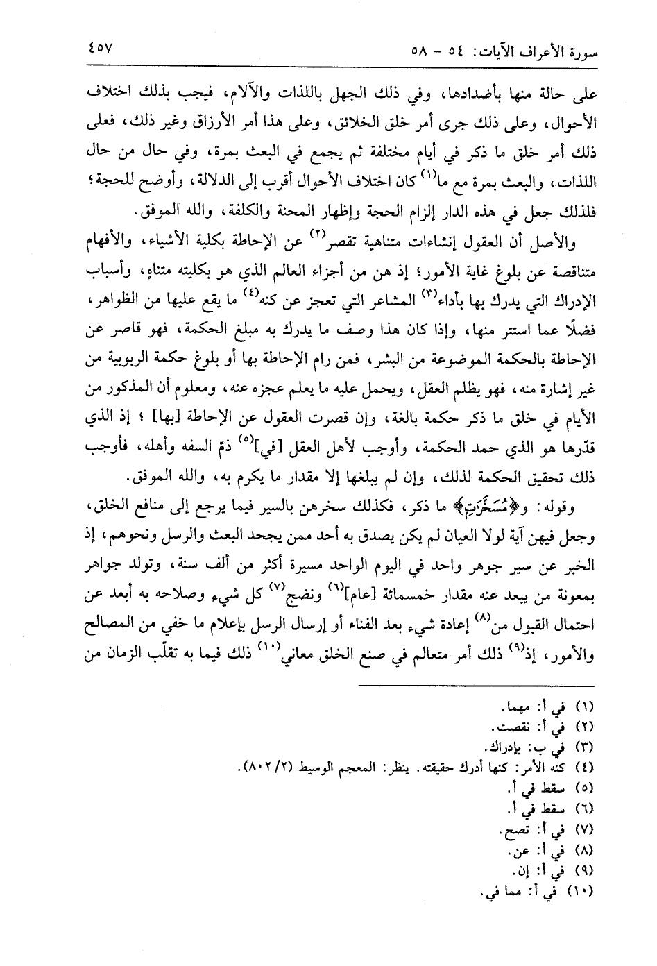 والأصل أن العقول إنشاءات متناهية تقصر عن الإحاطة بكلية الأشياء، والأفهام متناقصة عن بلوغ غاية الأمور؛ إذ هن من أجزاء العالم الذي هو بكليته متناهٍ، وأسباب الإدراك التي يدرك بها باداء المشاعر التي تعجز عن كنه ما يقع عليها من الظواهر، فضلًا عما استتر منها، وإذا كان هذا وصف ما يدرك به مبلغ الحكمة، فهو قاصر عن الإحاطة بالحكمة الموضوعة من البشر، فمن رام الإحاطة بها أو بلوغ حكمة الربوبية من غير إشارة منه، فهو يظلم العقل، ويحمل عليه ما يعلم عجزه عنه، ومعلوم أن المذكور من الأيام في خلق ما ذكر حكمة بالغة، وإن قصرت العقول عن الإحاطة بها؛ إذ الذي قدَّرها هو الذي حمد الحكمة، وأوجب لأهل العقل في ذم السفه وأهله، فأوجب ذلك تحقيق الحكمة لذلك، وإن لم يبلغها إلا مقدار ما يكرم به، واللَّه الموفق.