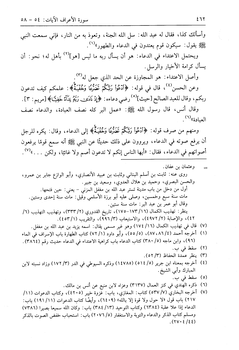 وأسألك كذا، فقال له عبد اللَّه: سل اللَّه الجنة، وتعوذ به من النار، فإني سمعت النبي - صَلَّى اللَّهُ عَلَيهِ وَسَلَّمَ - يقول: سيكون قوم يعتدون في الدعاء والطهور ".