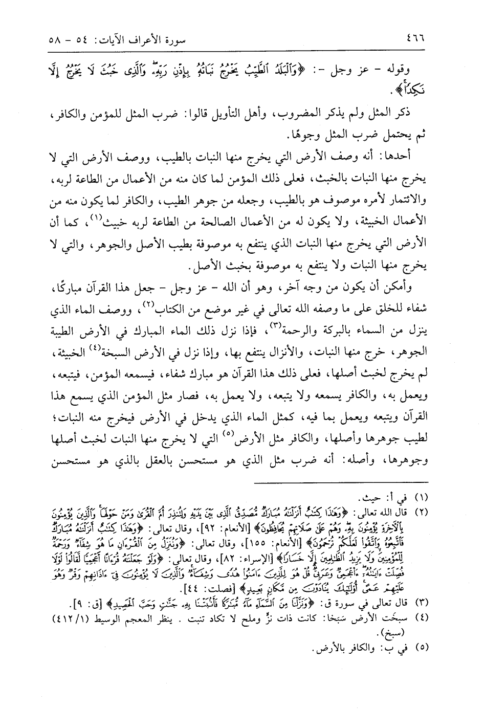 وقوله - عَزَّ وَجَلَّ -: (وَالْبَلَدُ الطَّيِّبُ يَخْرُجُ نَبَاتُهُ بِإِذْنِ رَبِّهِ وَالَّذِي خَبُثَ لَا يَخْرُجُ إِلَّا نَكِدًا ... (58)