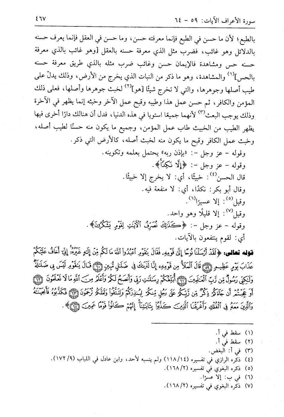 قوله تعالى: (لَقَدْ أَرْسَلْنَا نُوحًا إِلَى قَوْمِهِ فَقَالَ يَا قَوْمِ اعْبُدُوا اللَّهَ مَا لَكُمْ مِنْ إِلَهٍ غَيْرُهُ إِنِّي أَخَافُ عَلَيْكُمْ عَذَابَ يَوْمٍ عَظِيمٍ (59) قَالَ الْمَلَأُ مِنْ قَوْمِهِ إِنَّا لَنَرَاكَ فِي ضَلَالٍ مُبِينٍ (60) قَالَ يَا قَوْمِ لَيْسَ بِي ضَلَالَةٌ وَلَكِنِّي رَسُولٌ مِنْ رَبِّ الْعَالَمِينَ (61) أُبَلِّغُكُمْ رِسَالَاتِ رَبِّي وَأَنْصَحُ لَكُمْ وَأَعْلَمُ مِنَ اللَّهِ مَا لَا تَعْلَمُونَ (62) أَوَعَجِبْتُمْ أَنْ جَاءَكُمْ ذِكْرٌ مِنْ رَبِّكُمْ عَلَى رَجُلٍ مِنْكُمْ لِيُنْذِرَكُمْ وَلِتَتَّقُوا وَلَعَلَّكُمْ تُرْحَمُونَ (63) فَكَذَّبُوهُ فَأَنْجَيْنَاهُ وَالَّذِينَ مَعَهُ فِي الْفُلْكِ وَأَغْرَقْنَا الَّذِينَ كَذَّبُوا بِآيَاتِنَا إِنَّهُمْ كَانُوا قَوْمًا عَمِينَ (64)