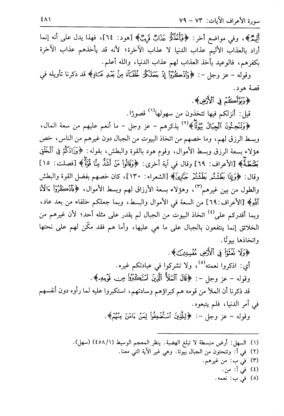 (وَتَنْحِتُونَ الْجِبَالَ بُيُوتًا) يذكرهم - عَزَّ وَجَلَّ - ما أنعم عليهم من سعة المال، وبسط الرزق لهم، وما خصهم من اتخاذ البيوت من الجبال دون غيرهم من الناس، خص هؤلا بسعة الرزق وبسط الأموال، وقوم هود بالقوة والبطش، بقوله: (وَزَادَكُمْ فِي الْخَلْقِ بَسْطَةً)، وقال في آية أخرى: (وَقَالُوا مَنْ أَشَدُّ مِنَّا قُوَّةً)، وقال: (وَإِذَا بَطَشْتُمْ بَطَشْتُمْ جَبَّارِينَ)، كان خصهم بفضل القوة والبطش والطول من بين غيرهم، وهَؤُلَاءِ بسعة الأرزاق لهم وبسط الأموال، (فَاذْكُرُوا آلَاءَ اللَّهِ)، من السعة في الأموال والبسط، وبما جعلكم خلفاء من بعد عاد، وبما أقدركم على اتخاذ البيوت من الجبال لم يقدر على مثله أحد؛ لأن غيرهم من الخلائق إنما ينتفعون بالجبال على ما هي عليها، وأما هم فقد مكّن لهم على نحتها واتخاذها بيوتًا.