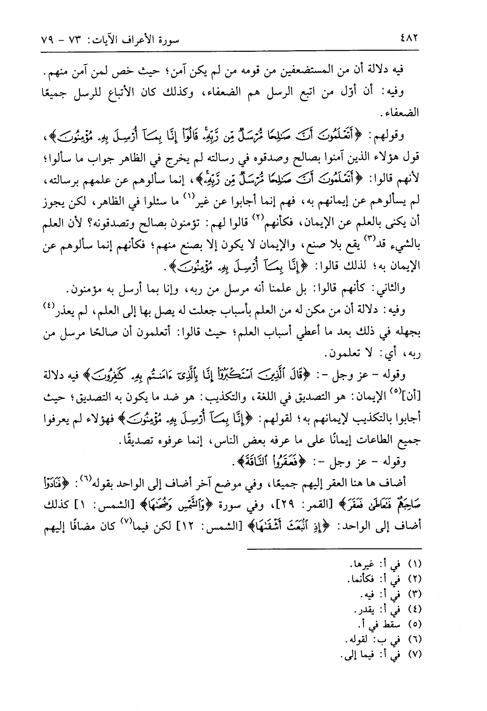وقولهم: (أَتَعْلَمُونَ أَنَّ صَالِحًا مُرْسَلٌ مِنْ رَبِّهِ قَالُوا إِنَّا بِمَا أُرْسِلَ بِهِ مُؤْمِنُونَ)، قول هَؤُلَاءِ الذين آمنوا بصالح وصدقوه في رسالته لم يخرج في الظاهر جواب ما سألوا؛ لأنهم قالوا: (أَتَعْلَمُونَ أَنَّ صَالِحًا مُرْسَلٌ مِنْ رَبِّهِ)، إنما سألوهم عن علمهم برسالته، لم يسألوهم عن إيمانهم به، فهم إنما أجابوا عن غير ما سئلوا في الظاهر، لكن يجوز أن يكنى بالعلم عن الإيمان، فكأنهم قالوا لهم: تؤمنون بصالح وتصدقونه؟ لأن العلم بالشيء قد يقع بلا صنع، والإيمان لا يكون إلا بصنع منهم؛ فكأنهم إنما سألوهم عن الإيمان به؛ لذلك قالوا: (إِنَّا بِمَا أُرْسِلَ بِهِ مُؤْمِنُونَ).