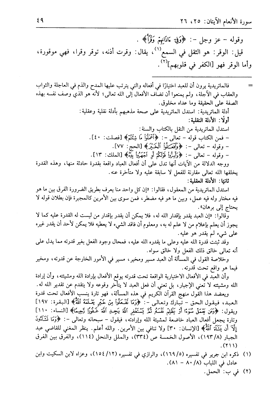 وقوله - عَزَّ وَجَلَّ -: (وَفِي آذَانِهِمْ وَقْرًا).