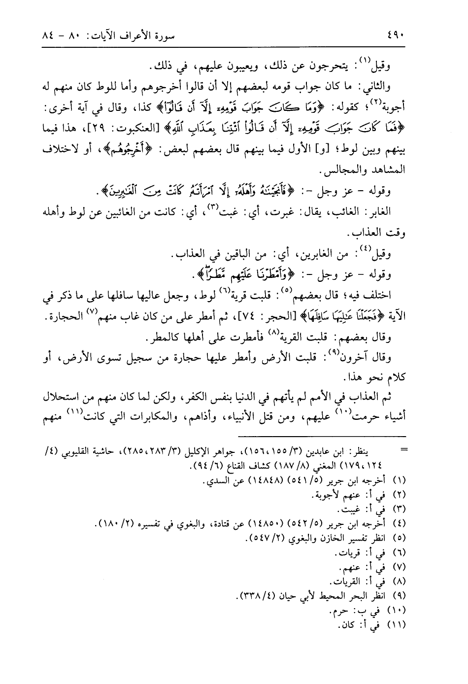 والثاني: ما كان جواب قومه لبعضهم إلا أن قالوا أخرجوهم وأما للوط كان منهم له أجوبة؛ كقوله: (وَمَا كَانَ جَوَابَ قَوْمِهِ إِلَّا أَنْ قَالُوا) كذا، وقال في آية أخرى: (فَمَا كَانَ جَوَابَ قَوْمِهِ إِلَّا أَنْ قَالُوا ائْتِنَا بِعَذَابِ اللَّهِ)، هذا فيما بينهم وبين لوط؛ ولأول فيما بينهم قَالَ بَعْضُهُمْ لبعض: (أَخْرِجُوهُمْ)، أو لاختلاف المشاهد والمجالس.