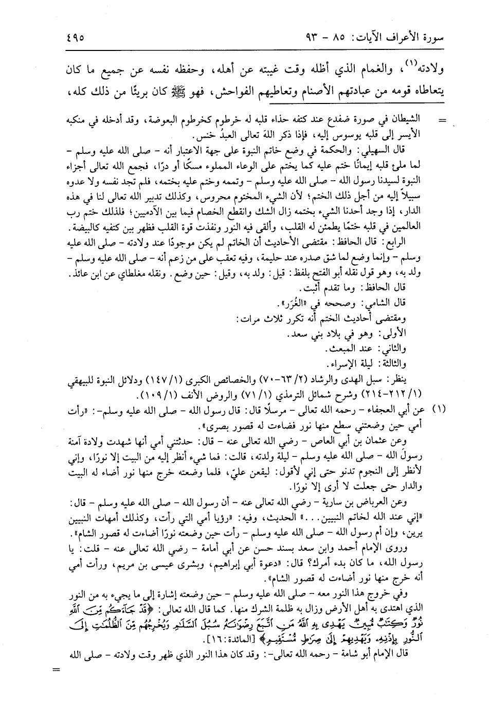 ولادته، والغمام الذي أظله وقت غيبته عن أهله، وحفظه نفسه عن جميع ما كان يتعاطاه قومه من عبادتهم الأصنام وتعاطيهم الفواحش، فهو - صَلَّى اللَّهُ عَلَيهِ وَسَلَّمَ - كان بريئًا من ذلك كله،