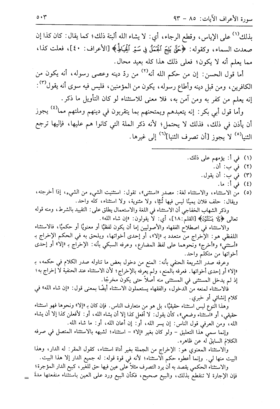 وأما قول أبي بكر: إنه يتعبدهم ويمتحنهم بما يتقربون في دينهم وملتهم مما يجوز أن يأذن في ذلك، فذلك لا يحتمل؛ لأنه ذكر الملة التي كانوا هم عليها، فإليها ترجع الثنيا لا يجوز أن تصرف الثنيا، إلى غيرها.