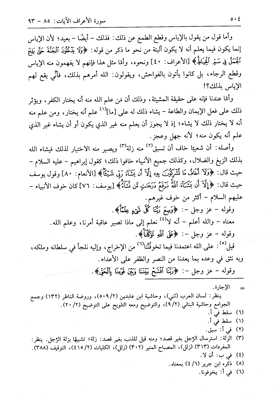 وأما قول من يقول بالإياس وقطع الطمع عن ذلك: فذلك -أيضًا- بعيد؛ لأن الإياس إنما يكون فيما يعلم أنه لا يكون ألبتَّة من نحو ما ذكر من قوله: (وَلَا يَدْخُلُونَ الْجَنَّةَ حَتَّى يَلِجَ الْجَمَلُ فِي سَمِّ الْخِيَاطِ)، ونحوه، وأمَّا مثل هذا فإنهم لا يفهمون منه الإياس وقطع الرجاء، بل كانوا يأتون بالفواحش، ويقولون: اللَّه أمرهم بذلك، فأنَّي يقع لهم الإياس بذلك؟!