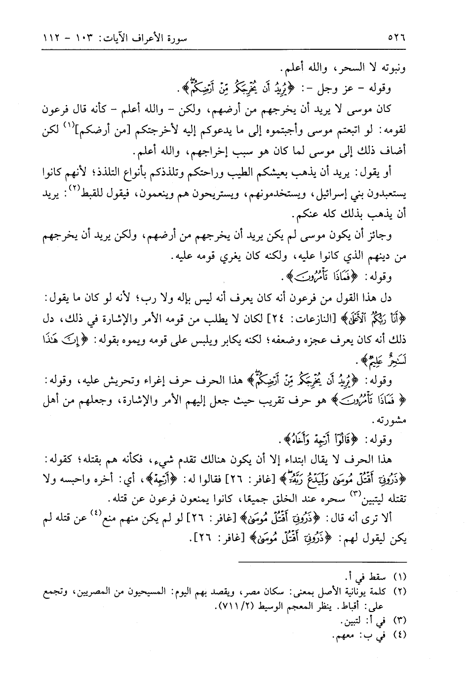 كان موسى لا يريد أن يخرجهم من أرضهم، ولكن - واللَّه أعلم - كأنه قال فرعون لقومه: لو اتبعتم موسى وأجبتموه إلى ما يدعوكم إليه لأخرجتكم من أرضكم، لكن أضاف ذلك إلى موسى لما كان هو سبب إخراجهم، واللَّه أعلم.