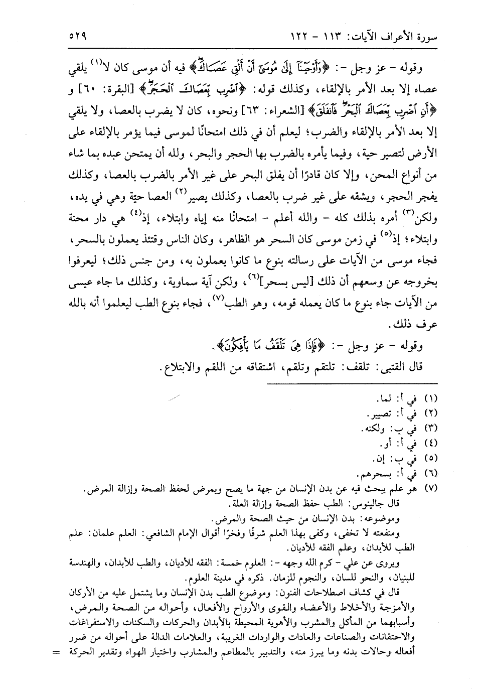وقوله - عَزَّ وَجَلَّ -: (وَأَوْحَيْنَا إِلَى مُوسَى أَنْ أَلْقِ عَصَاكَ ... (117) فيه أن موسى كان لا يلقي عصاه إلا بعد الأمر بالإلقاء، وكذلك قوله: (اضْرِبْ بِعَصَاكَ الْحَجَرَ) و (أَنِ اضْرِبْ بِعَصَاكَ الْبَحْرَ فَانْفَلَقَ)، ونحوه، كان لا يضرب بالعصا، ولا يلقي إلا بعد الأمر بالإلقاء والضرب؛ ليعلم أن في ذلك امتحانًا لموسى فيما يؤمر بالإلقاء على الأرض لتصير حية، وفيما يأمره بالضرب بها الحجر والبحر، ولله أن يمتحن عبده بما شاء من أنواع المحن، وإلا كان قادرًا أن يفلق البحر على غير الأمر بالضرب بالعصا، وكذلك يفجر الحجر، ويشقه على غير ضرب بالعصا، وكذلك يصير العصا حية وهي في يده، ولكن أمره بذلك كله - واللَّه أعلم - امتحانا منه إياه وابتلاء، إذ هي دار محنة وابتلاء؛ إذ في زمن موسى كان السحر هو الظاهر، وكان الناس وقتئذ يعملون بالسحر، فجاء موسى من الآيات على رسالته بنوع ما كانوا يعملون به، ومن جنس ذلك؛ ليعرفوا بخروجه عن وسعهم أن ذلك أليس بسحر، ولكن آية سماوية، وكذلك ما جاء عيسى من الآيات جاء بنوع ما كان يعمله قومه، وهو الطب، فجاء بنوع الطب ليعلموا أنه بالله عرف ذلك.