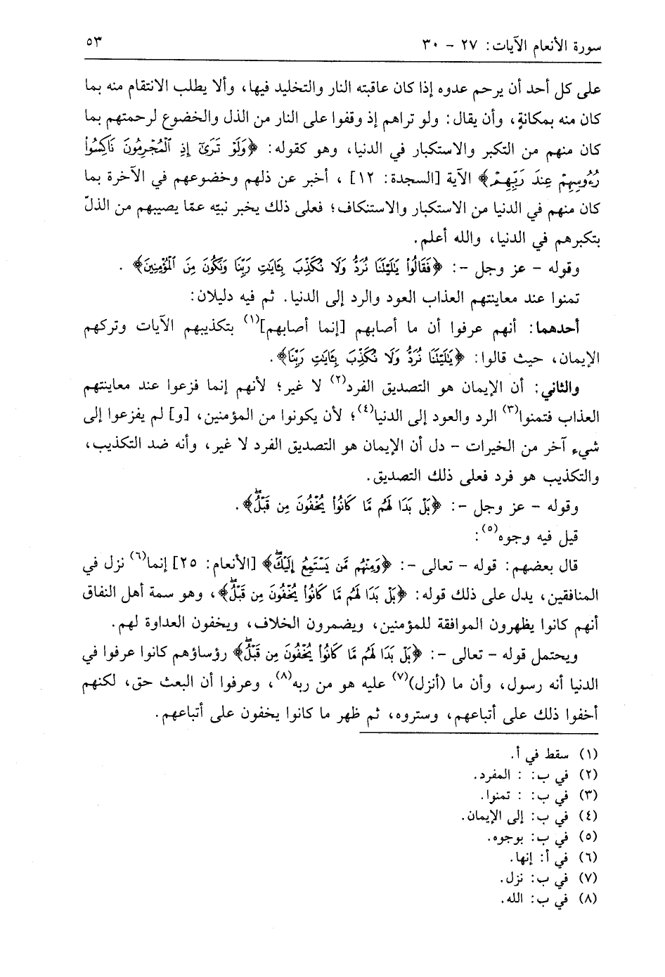 وقوله - عَزَّ وجل -: (فَقَالُوا يَا لَيْتَنَا نُرَدُّ وَلَا نُكَذِّبَ بِآيَاتِ رَبِّنَا وَنَكُونَ مِنَ الْمُؤْمِنِينَ).