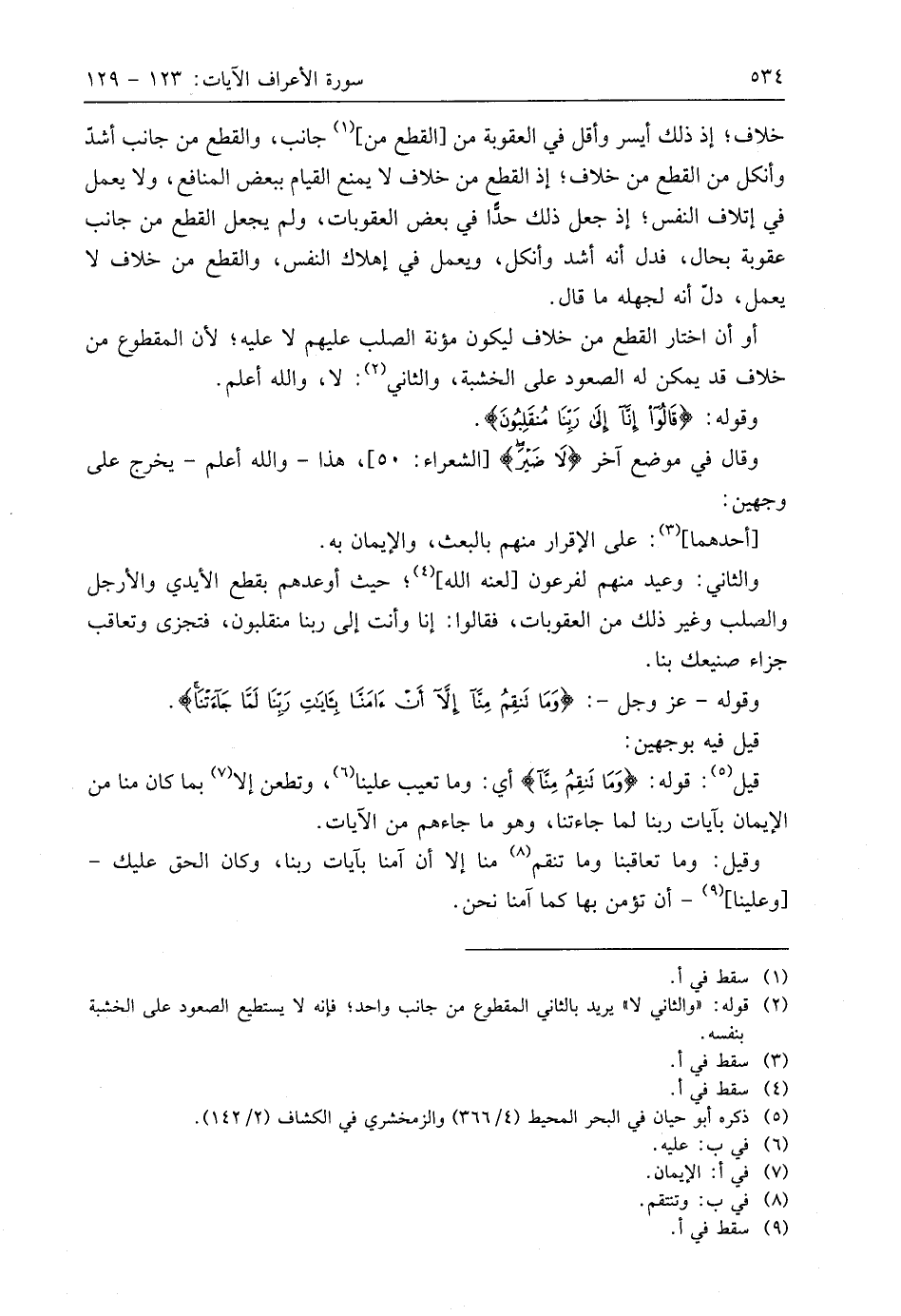 أو أن اختار القطع من خلاف ليكون مؤنة الصلب عليهم لا عليه؛ لأن المقطوع من خلاف قد يمكن له الصعود على الخشبة، والثاني: لا، واللَّه أعلم. وقوله: (قَالُوا إِنَّا إِلَى رَبِّنَا مُنْقَلِبُونَ (125)