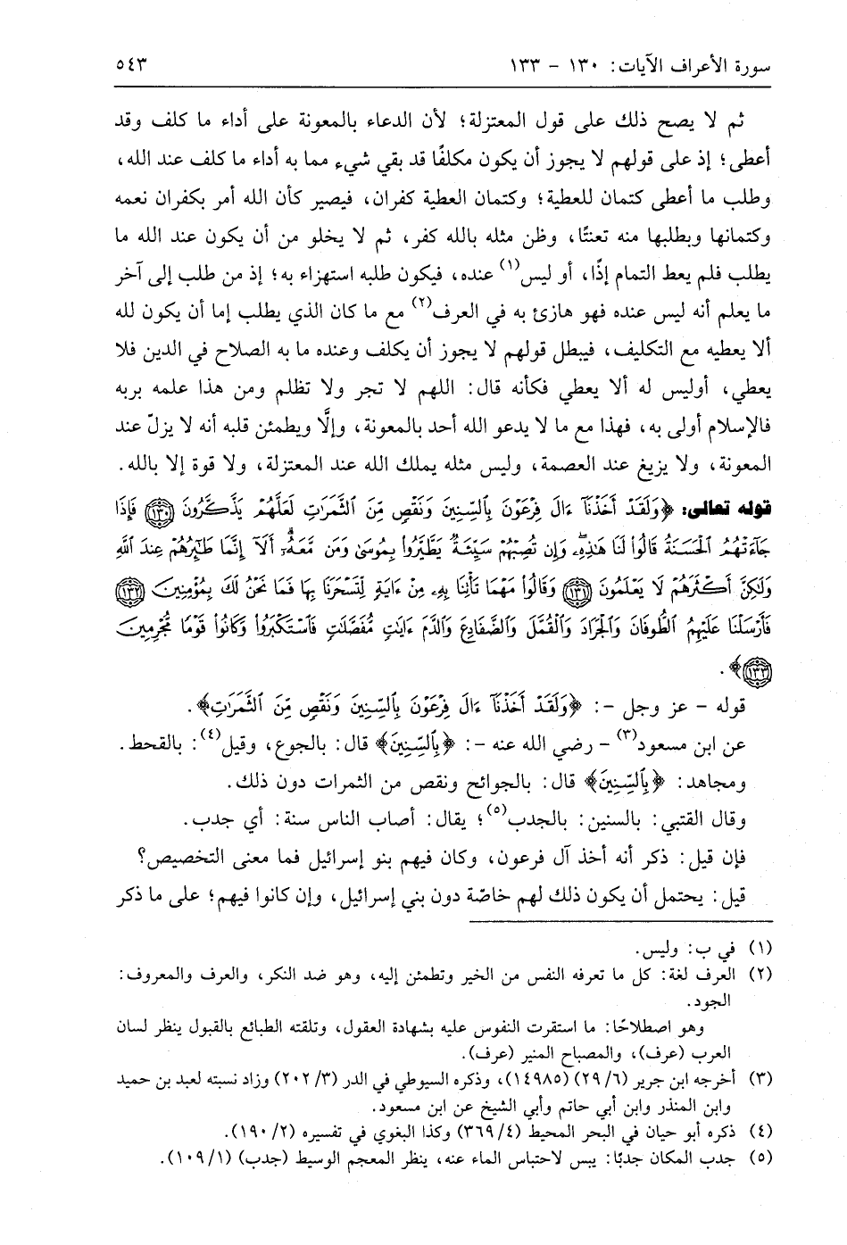 قوله - عَزَّ وَجَلَّ -: (وَلَقَدْ أَخَذْنَا آلَ فِرْعَوْنَ بِالسِّنِينَ وَنَقْصٍ مِنَ الثَّمَرَاتِ).