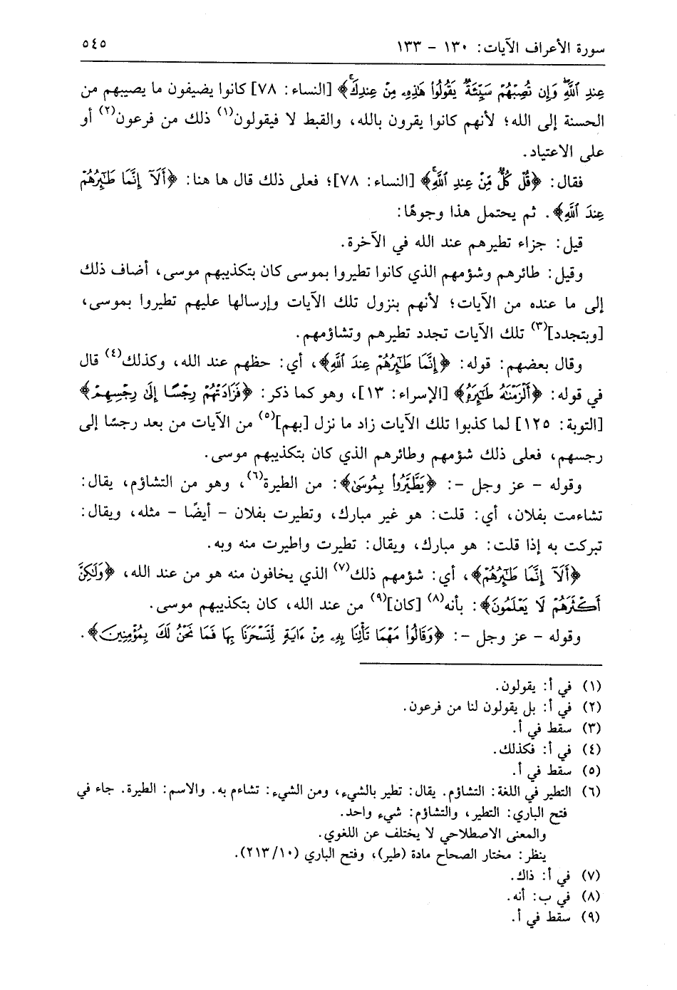 وقَالَ بَعْضُهُمْ: قوله: (إِنَّمَا طَائِرُهُمْ عِنْدَ اللَّهِ)، أي: حظهم عند اللَّه، وكذلك قال في قوله: (أَلْزَمْنَاهُ طَائِرَهُ)، وهو كما ذكر: (فَزَادَتْهُمْ رِجْسًا إِلَى رِجْسِهِمْ) لما كذبوا تلك الآيات زاد ما نزل بهم من الآيات من بعد رجسًا إلى رجسهم، فعلى ذلك شؤمهم وطائرهم الذي كان بتكذيبهم موسى.