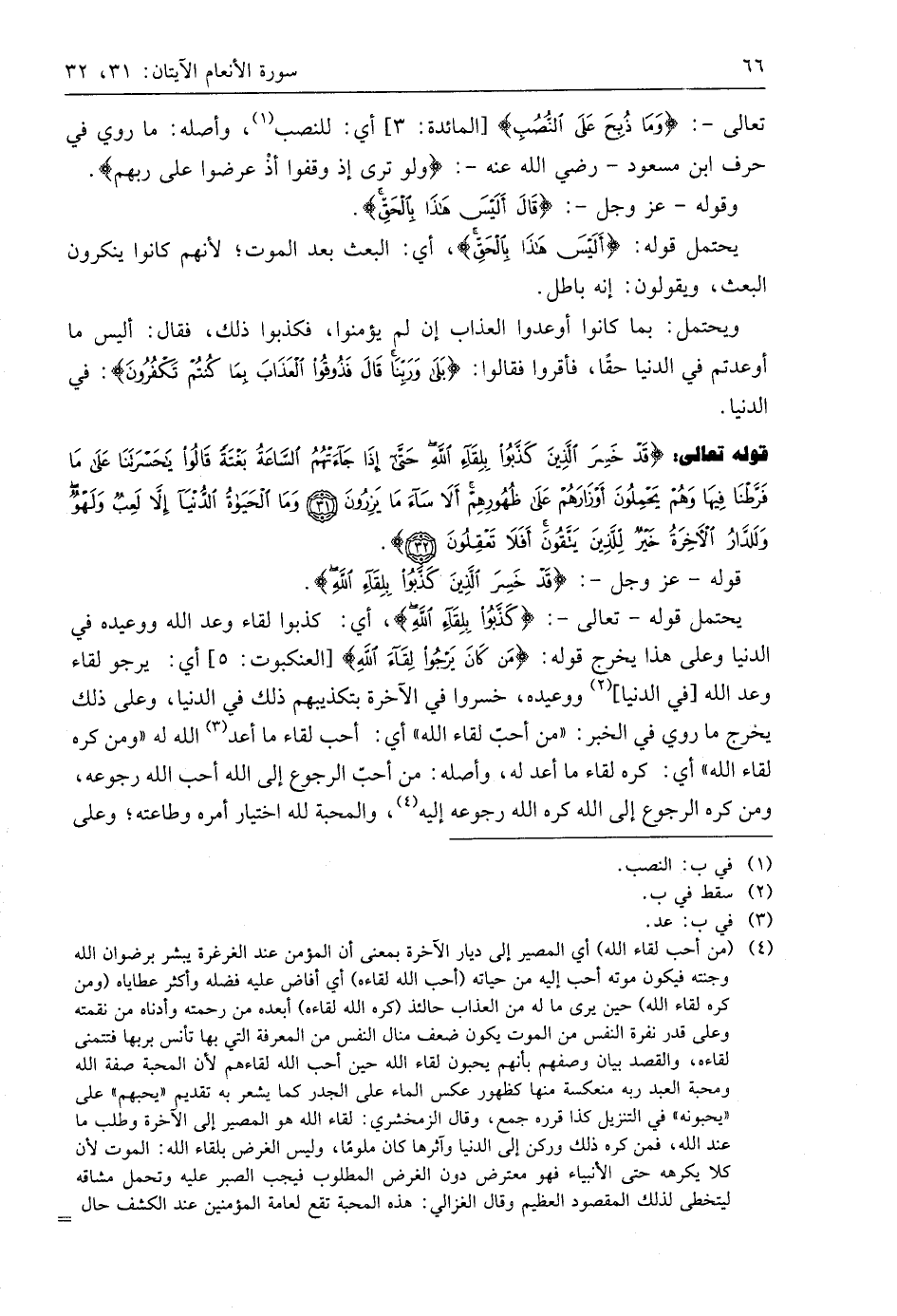 تعالى -: (وَمَا ذُبِحَ عَلَى النُّصُبِ)، أي: للنصب، وأصله: ما روي في حرف ابن مسعود - رَضِيَ اللَّهُ عَنْهُ -: (ولو ترى إذ وقفوا إذ عرضوا على ربهم).