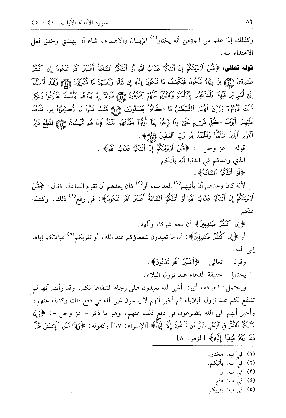 قوله تعالى: (قُلْ أَرَأَيْتَكُمْ إِنْ أَتَاكُمْ عَذَابُ اللَّهِ أَوْ أَتَتْكُمُ السَّاعَةُ أَغَيْرَ اللَّهِ تَدْعُونَ إِنْ كُنْتُمْ صَادِقِينَ (40) بَلْ إِيَّاهُ تَدْعُونَ فَيَكْشِفُ مَا تَدْعُونَ إِلَيْهِ إِنْ شَاءَ وَتَنْسَوْنَ مَا تُشْرِكُونَ (41) وَلَقَدْ أَرْسَلْنَا إِلَى أُمَمٍ مِنْ قَبْلِكَ فَأَخَذْنَاهُمْ بِالْبَأْسَاءِ وَالضَّرَّاءِ لَعَلَّهُمْ يَتَضَرَّعُونَ (42) فَلَوْلَا إِذْ جَاءَهُمْ بَأْسُنَا تَضَرَّعُوا وَلَكِنْ قَسَتْ قُلُوبُهُمْ وَزَيَّنَ لَهُمُ الشَّيْطَانُ مَا كَانُوا يَعْمَلُونَ (43) فَلَمَّا نَسُوا مَا ذُكِّرُوا بِهِ فَتَحْنَا عَلَيْهِمْ أَبْوَابَ كُلِّ شَيْءٍ حَتَّى إِذَا فَرِحُوا بِمَا أُوتُوا أَخَذْنَاهُمْ بَغْتَةً فَإِذَا هُمْ مُبْلِسُونَ (44) فَقُطِعَ دَابِرُ الْقَوْمِ الَّذِينَ ظَلَمُوا وَالْحَمْدُ لِلَّهِ رَبِّ الْعَالَمِينَ (45)