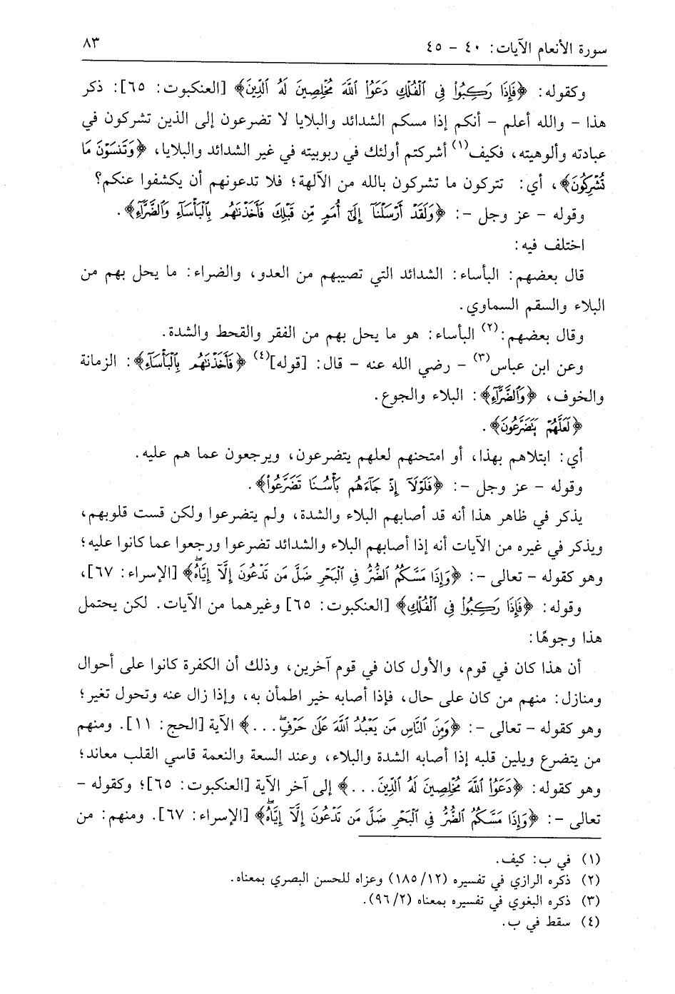وكقوله: (فَإِذَا رَكِبُوا فِي الْفُلْكِ دَعَوُا اللَّهَ مُخْلِصِينَ لَهُ الدِّينَ): ذكر هذا - واللَّه أعلم - أنكم إذا مسكم الشدائد والبلايا لا تضرعون إلى الذين تشركون في عبادته وألوهيته، فكيف أشركتم أُولَئِكَ في ربوبيته في غير الشدائد والبلايا، (وَتَنْسَوْنَ مَا تُشْرِكُونَ (41)، أي: تتركون ما تشركون باللَّه من الآلهة؛ فلا تدعونهم أن يكشفوا عنكم؟