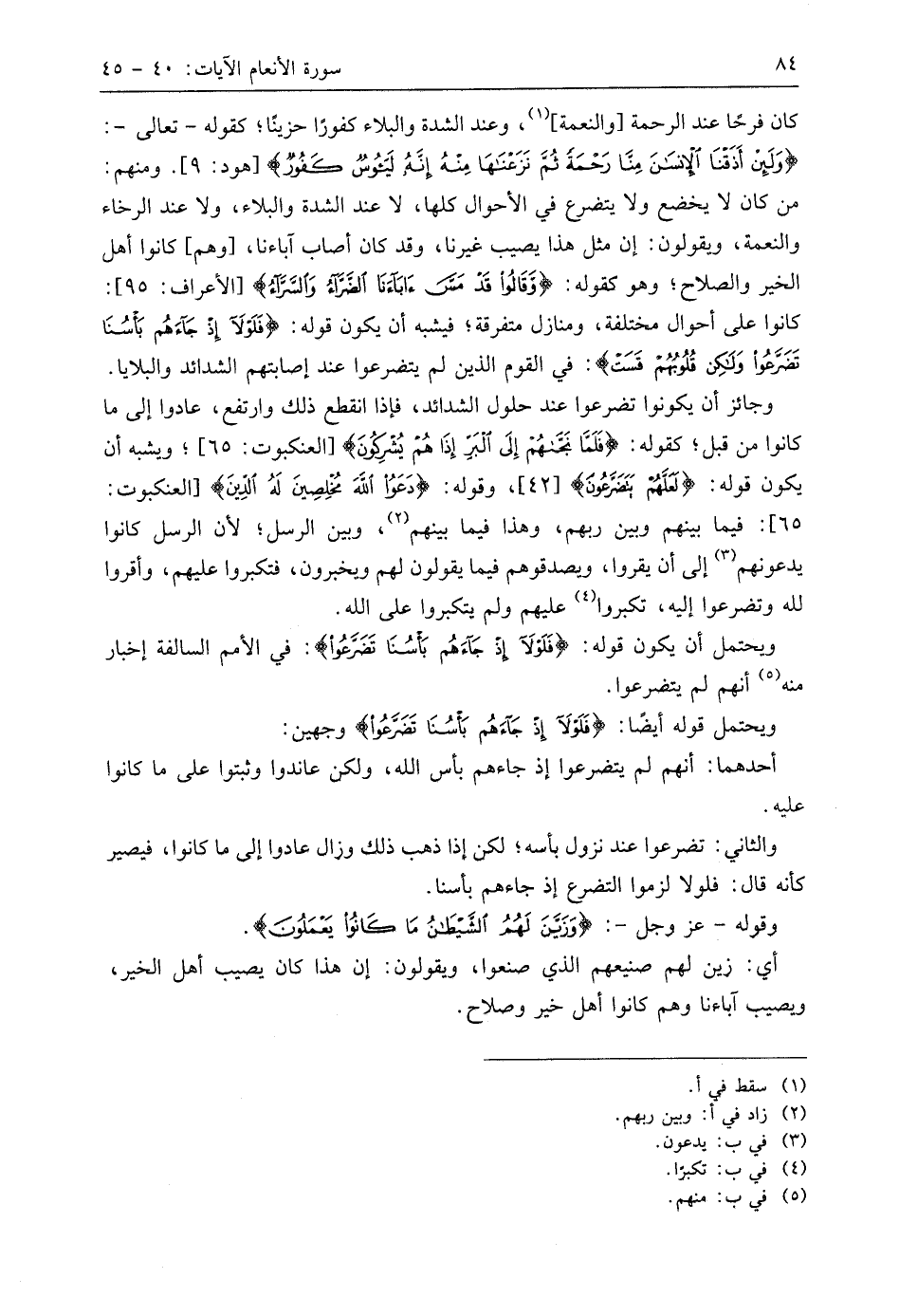كان فرحًا عند الرحمة والنعمة، وعند الشدة والبلاء كفورًا حزينا؛ كقوله - تعالى -: (وَلَئِنْ أَذَقْنَا الْإِنْسَانَ مِنَّا رَحْمَةً ثُمَّ نَزَعْنَاهَا مِنْهُ إِنَّهُ لَيَئُوسٌ كَفُورٌ). ومنهم: من كان لا يخضع ولا يتضرع في الأحوال كلها، لا عند الشدة والبلاء، ولا عند الرخاء والنعمة، ويقولون: إن مثل هذا يصيب غيرنا، وقد كان أصاب آباءنا، وهم، كانوا أهل الخير والصلاح؛ وهو كقوله؛ (وَقَالُوا قَدْ مَسَّ آبَاءَنَا الضَّرَّاءُ وَالسَّرَّاءُ): كانوا على أحوال مختلفة، ومنازل متفرقة؛ فيشبه أن يكون قوله: (فَلَوْلَا إِذْ جَاءَهُمْ بَأْسُنَا تَضَرَّعُوا وَلَكِنْ قَسَتْ قُلُوبُهُمْ): في القوم الذين لم يتضرعوا عند إصابتهم الشدائد والبلايا.