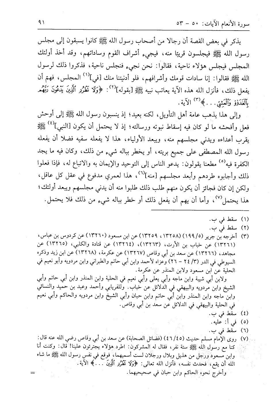 وإلى هذا يذهب عامة أهل التأويل، لكنه بعيد؛ إذ ينسبون رسول اللَّه - صَلَّى اللَّهُ عَلَيهِ وَسَلَّمَ - إلى أوحش فعل وأفحشه ما لو كان فيه إسقاط نبوته ورسالته؛ إذ لا يحتمل أن يكون النبي - صَلَّى اللَّهُ عَلَيهِ وَسَلَّمَ - يقرب أعداءه ويدني مجلسهم منه، ويبعد الأولياء، هذا لا يفعله سفيه فضلا أن يفعله رسول اللَّه المصطفى على جميع بريته، أو يخطر بباله شيء من ذلك، وكان فيه ما يجد الكفرة فيه مطعنا يقولون: يدعو الناس إلى التوحيد والإيمان به والاتباع له، فإذا فعلوا ذلك وأجابوه طردهم وأبعد مجلسهم منه، هذا لعمري مدفوع في عقل كل عاقل، ولكن إن كان فجائز أن يكون منهم طلب ذلك طلبوا منه أن يدني مجلسهم ويبعد أُولَئِكَ؛ هذا يحتمل، وأما أن يهم أن يفعل ذلك أو خطر بباله شيء من ذلك فلا يحتمل.