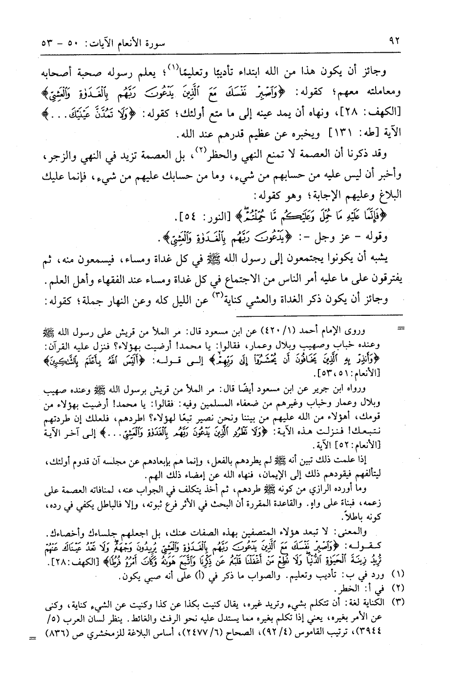 وجائز أن يكون هذا من اللَّه ابتداء تأديبًا وتعليمًا؛ يعلم رسوله صحبة أصحابه ومعاملته معهم؛ كقوله: (وَاصْبِرْ نَفْسَكَ مَعَ الَّذِينَ يَدْعُونَ رَبَّهُمْ بِالْغَدَاةِ وَالْعَشِيِّ يُرِيدُونَ وَجْهَهُ) ونهاه أن يمد عينه إلى ما متَّع أُولَئِكَ؛ كقوله: (وَلَا تَمُدَّنَّ عَيْنَيْكَ. . .) الآية، ويخبره عن عظيم قدرهم عند اللَّه.