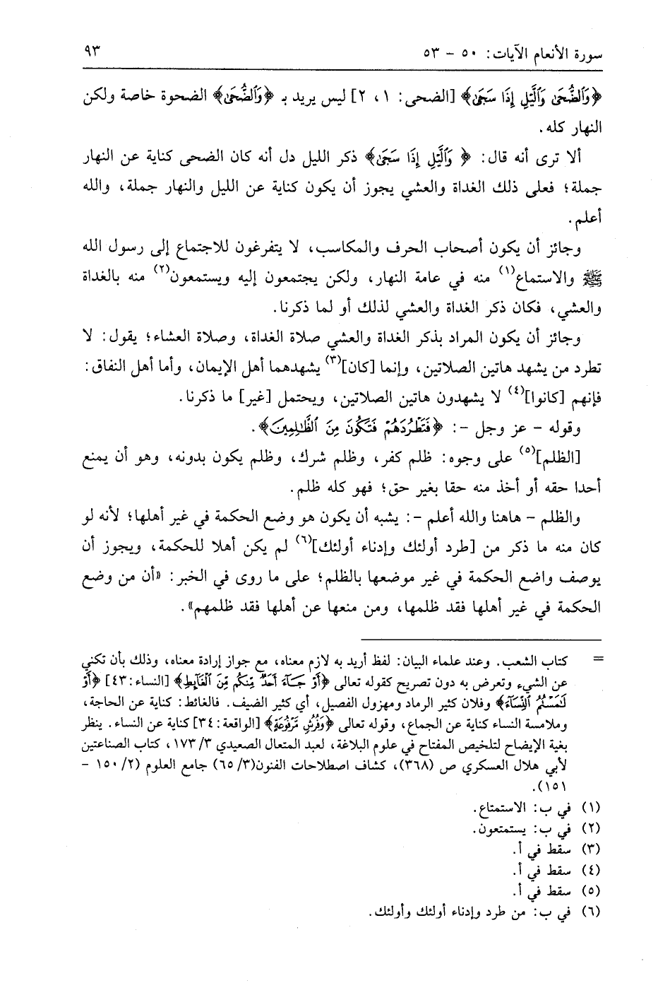 وجائز أن يكون المراد بذكر الغداة والعشي صلاة الغداة، وصلاة العشاء؛ يقول: لا تطرد من يشهد هاتين الصلاتين، وإنَّمَاكان يشهدهما أهل الإيمان، وأما أهل النفاق: فإنهم كانوا لا يشهدون هاتين الصلاتين، ويحتمل غير ما ذكرنا.