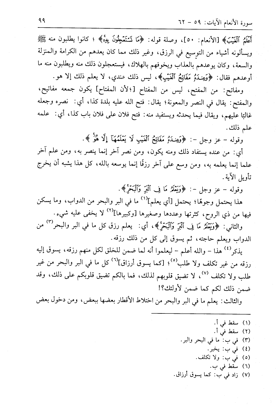وقوله - عَزَّ وَجَلَّ -: (وَعِنْدَهُ مَفَاتِحُ الْغَيْبِ لَا يَعْلَمُهَا إِلَّا هُوَ).
