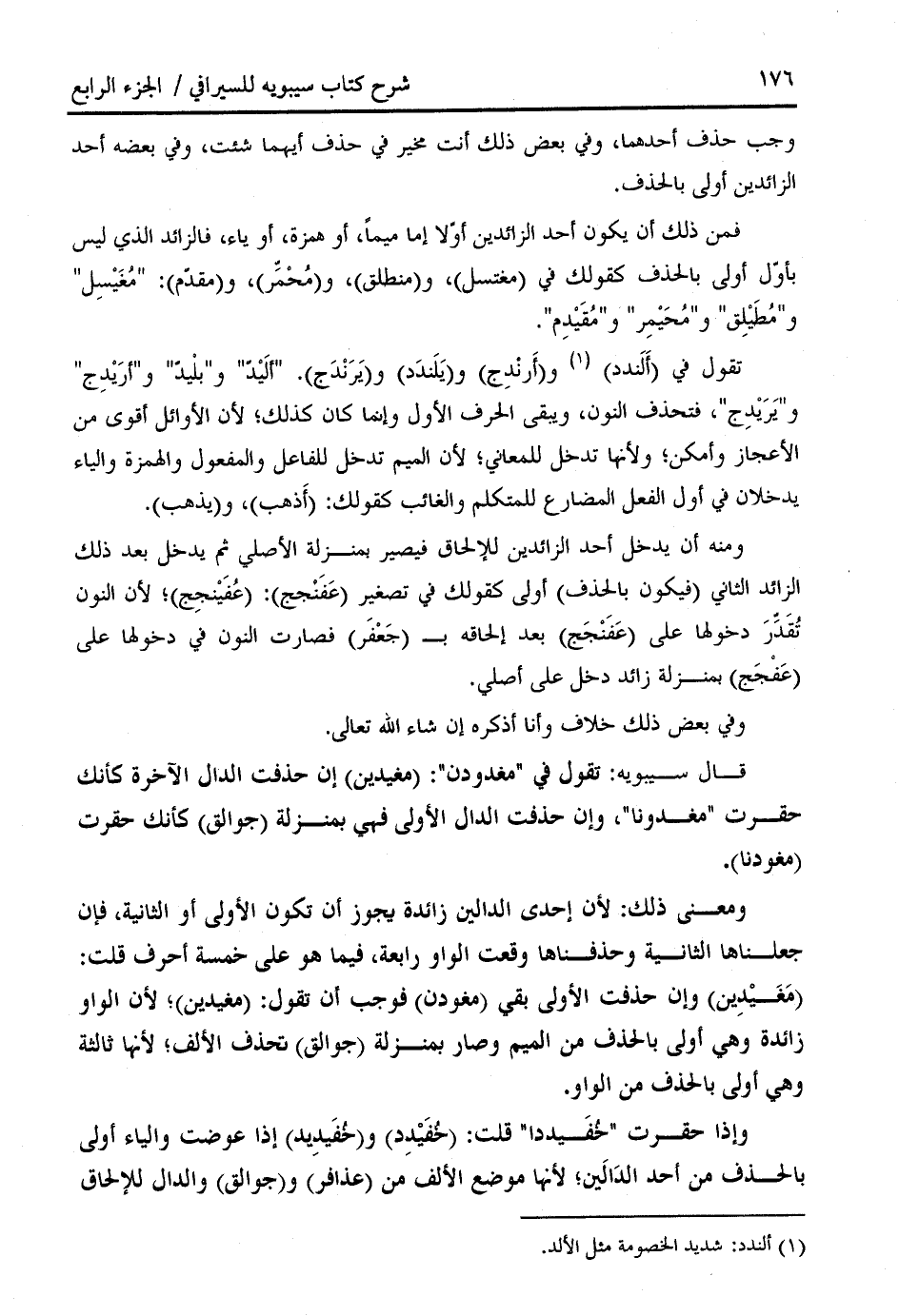 قال سيبويه: تقول في " مغدودن ": (مغيدين) إن حذفت الدال الآخرة كأنك حقرت " مغدونا "، وإن حذفت الدال الأولى فهي بمنزلة (جوالق) كأنك حقرت (مغودنا).