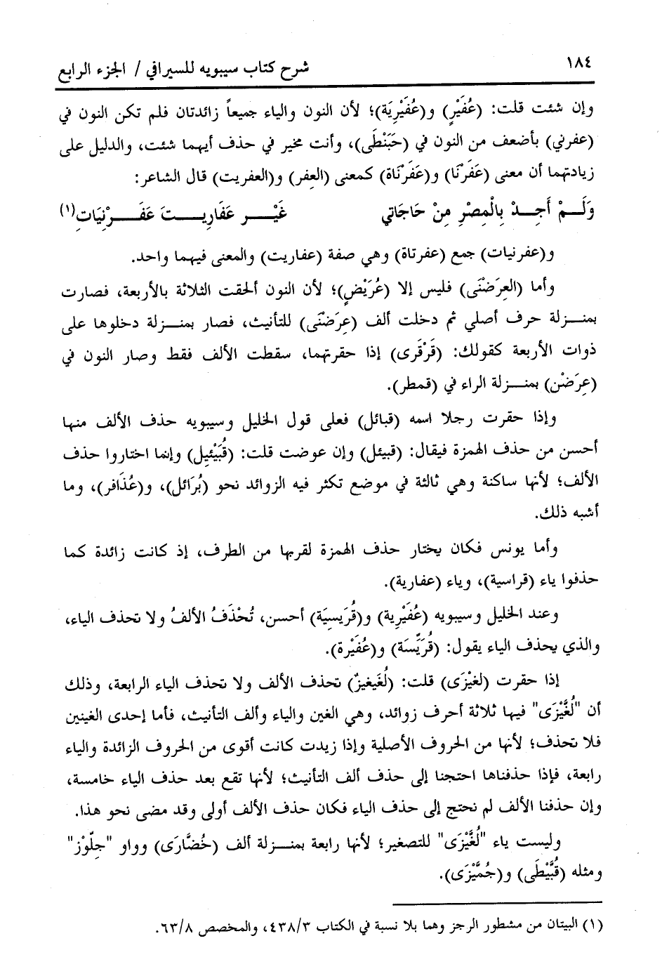 وعند الخليل وسيبويه (عفيرية) و (قريسية) أحسن، تحذف الألف ولا تحذف الياء، والذي يحذف الياء يقول: