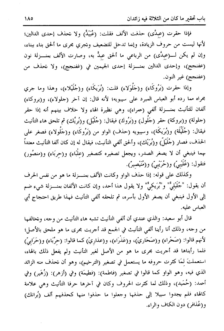 وإذا حقرت (بروكاء) و (جلولاء) قلت: (بريكاء) و (جليلاء)، وهذا وما جري مجراه مما رده أبو العباس المبرد على سيبويه؛ لأنه قال: إن آخر (جلولاء)، و (بروكاء) ألفان للتأنيث بمنزلة ألفي (حمراء)، وهي نظيرة الهاء ولا خلاف بينهم أنه إذا حقر (جلولة) و (بروكة) حقر (جلول) و (بروك) فيقال: (جليّل) و (بريّك) ثم تلحق هاء التأنيث فيقال: (جليّلة) و (بريكة)، وسيبويه (حذف) الواو من (بروكاء) و (جلولاء) فصغر على الحذف، فصار (جليل) و (بريك)، وألحق ألفي التأنيث، فيقال له إن كان ألفا التأنيث معتدا بهما فينبغي أن لا يصغر الصدر، ويجعل تصغيره كتصغير (علباء) و (حرباء) و (منصور) فتقول: (عليبيّ) و (حريبيّ) و (منيصير).
