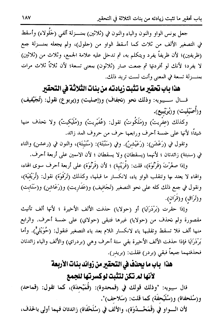 وإذا حقرت (بردرايا) أو (حولايا) حذفت الألف الأخيرة؛ لأنها ألف تأنيث مقصورة ولم تحذف من (حولايا) غيرها فتبقى (حولاي) على خمسة أحرف. والرابع منها ألف فلا تسقط وتقلبها ياء لانكسار اللام بعد ياء التصغير فنقول: (حويليّ). وأما بردرايا فإذا حذفت الألف الأخيرة بقي ستة أحرف وهي (بردراي) والألف والياء زائدتان فحذفتهما جميعا فبقي (بردر) فقلت: (بريدر).