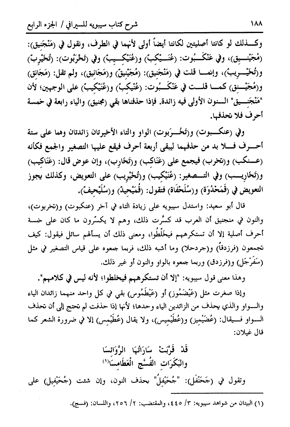 قال أبو سعيد: واستدل سيبويه على زيادة التاء في آخر (عنكبوت) و (تخربوت)، والنون في منجنيق أن العرب قد كسّرت ذلك، وهم لا يكسّرون ما كان على خمسة أحرف أصلية إلا أن تستكرههم فيخلّطوا، ومعنى ذلك أن يسألهم سائل فيقول: كيف تجمعون (فرزدقا) و (جردحلا) وما أشبه ذلك، فربما جمعوه على قياس التصغير في مثل (سفرجل) و (فرزدق) وربما جمعوه بالواو والنون أو غير ذلك.