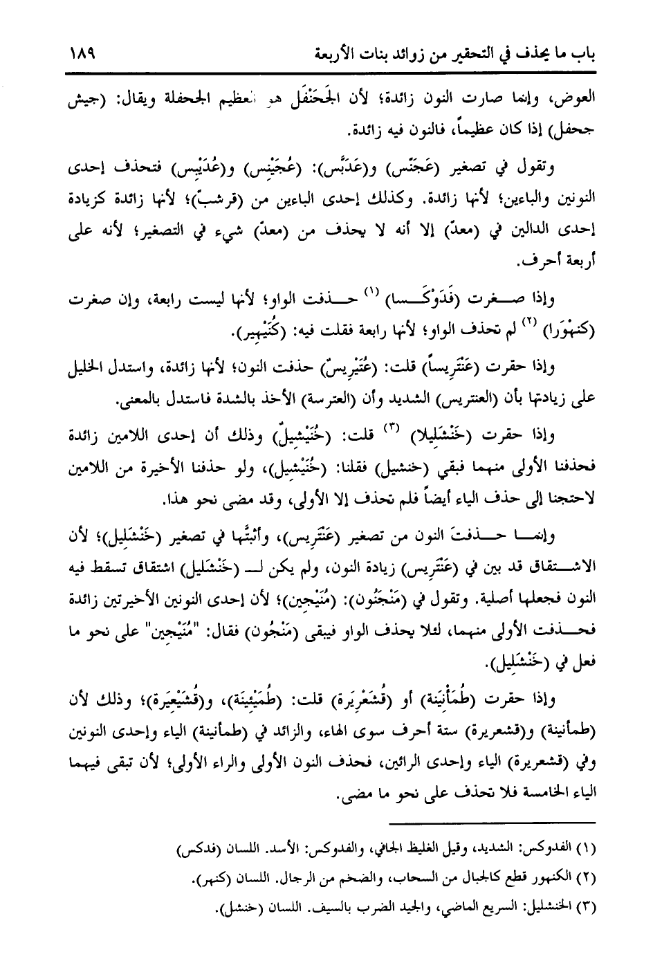 وإنما حذفت النون من تصغير (عنتريس)، وأثبتّها في تصغير (خنشليل)؛ لأن الاشتقاق قد بين في (عنتريس) زيادة النون، ولم يكن ل (خنشليل) اشتقاق تسقط فيه النون فجعلها أصلية. وتقول في (منجنون): (منيجين)؛ لأن إحدى النونين الأخيرتين زائدة فحذفت الأولى منهما، لئلا يحذف الواو فيبقى (منجون) فقال: " منيجين " على نحو ما فعل في (خنشليل).