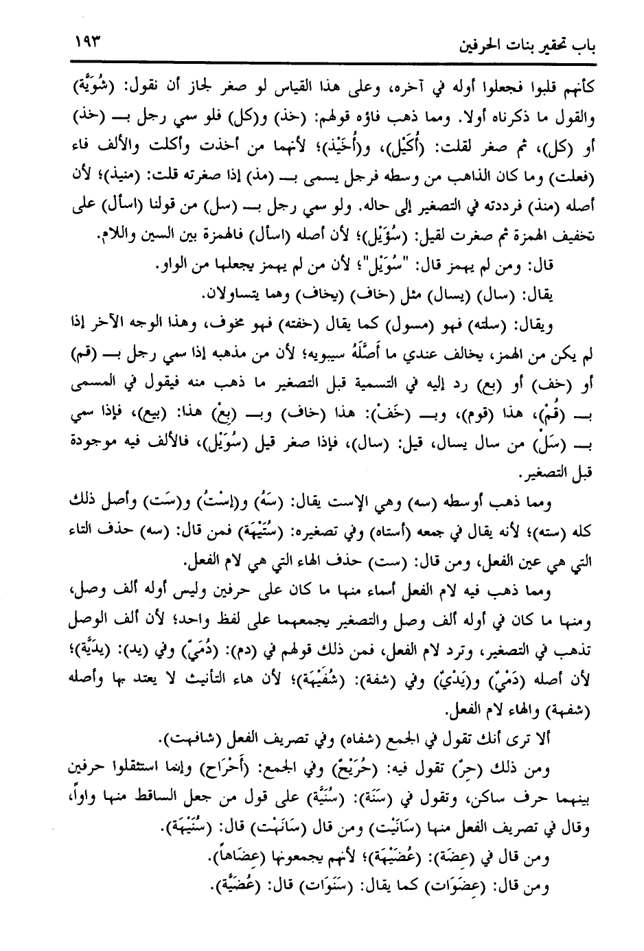 كأنهم قلبوا فجعلوا أوله في آخره، وعلى هذا القياس لو صغر لجاز أن نقول: (شويّة) والقول ما ذكرناه أولا. ومما ذهب فاؤه قولهم: (خذ) و (كل) فلو سمي رجل ب (خذ) أو (كل)، ثم صغر لقلت: (أكيل)، و (أخيذ)؛ لأنهما من أخذت وأكلت والألف فاء (فعلت) وما كان الذاهب من وسطه فرجل يسمى ب (مذ) إذا صغرته قلت: (منيذ)؛ لأن أصله (منذ) فرددته في التصغير إلى حاله. ولو سمي رجل ب (سل) من قولنا (اسأل) على تخفيف الهمزة ثم صغرت لقيل: (سؤيل)؛ لأن أصله (اسأل) فالهمزة بين السين واللام.