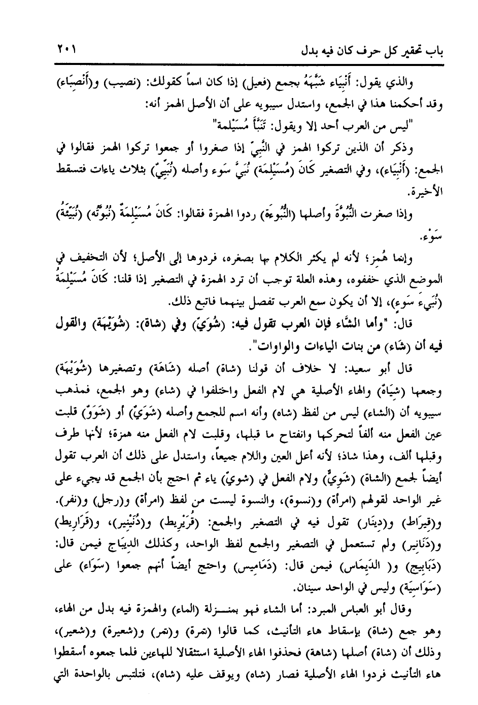 وذكر أن الذين تركوا الهمز في النّبيّ إذا صغروا أو جمعوا تركوا الهمز فقالوا في الجمع: (أنبياء)، وفي التصغير كان (مسيلمة) نبيّ سوء وأصله (نبيّي) بثلاث ياءات فتسقط الأخيرة.