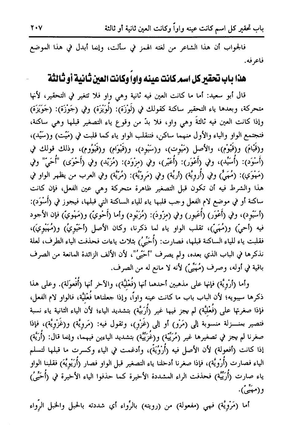 و (غزويّة)، فإذا صغرنا لم يجز في تصغيرها غير (مريّيّة) و (غزيّيّة) بتشديد الياءين فيهما، وإنما قال: (أريّة) إذا كانت (أفعولة) لأن الأصل فيه (أرويّة)، وأدغمت في الياء وكسرت ما قبلها لتسلم الياء فصارت (أرويّة)، فإذا صغرنا أدخلنا ياء التصغير قبل الواو فصار (أريويّه) فقلبنا الواو ياء صارت (أريّيّة) فحذفت الراء المشددة الأخيرة كما حذفوا الياء الأخيرة في (أحيّى) و (مهيّى).