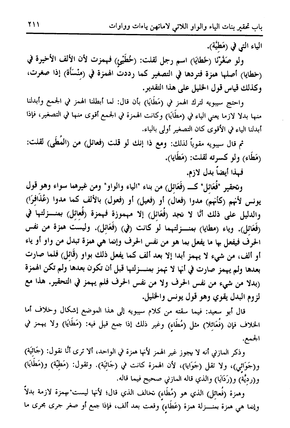 واحتج سيبويه لترك الهمز في (مطايا) بأن قال: لما أبطلنا الهمز في الجمع وأبدلنا منها بدلا لازما يعني الياء في (مطايا) وكانت الهمزة في الجمع أقوى منها في التصغير، فإذا أبدلنا الياء في الأقوى كان التصغير أولى بالياء.