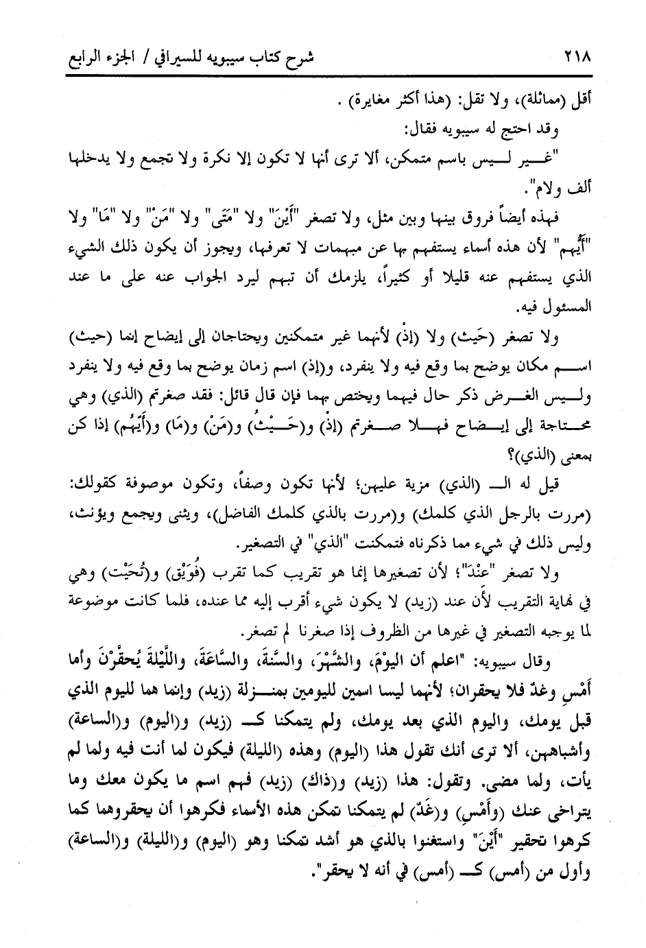 فهذه أيضا فروق بينها وبين مثل، ولا تصغر " أين " ولا " متى " ولا " من " ولا " ما " ولا " أيّهم " لأن هذه أسماء يستفهم بها عن مبهمات لا تعرفها، ويجوز أن يكون ذلك الشيء الذي يستفهم عنه قليلا أو كثيرا، يلزمك أن تبهم ليرد الجواب عنه على ما عند المسئول فيه.