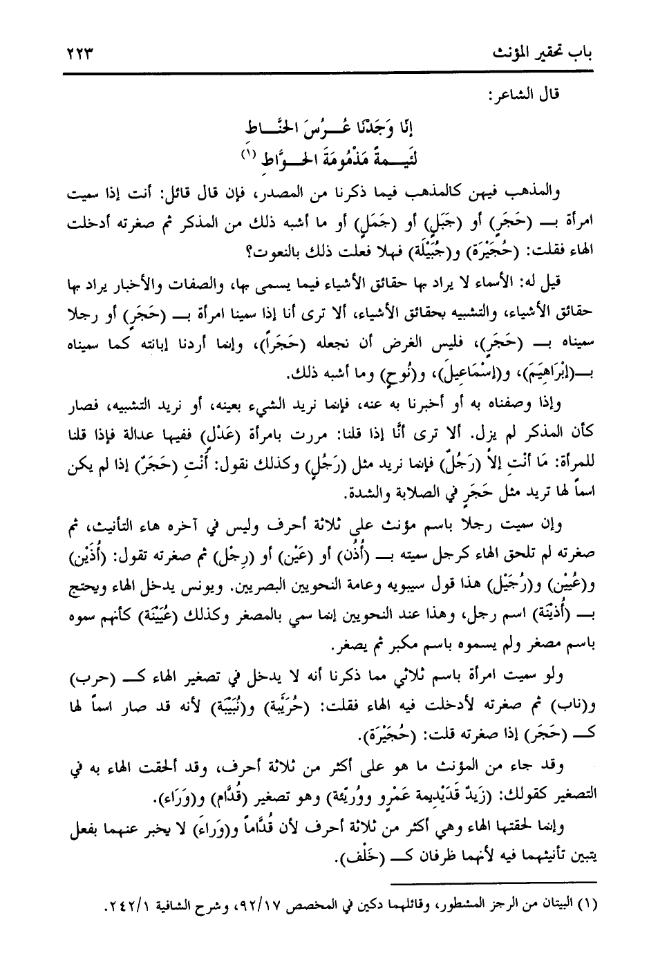 ولو سميت امرأة باسم ثلاثي مما ذكرنا أنه لا يدخل في تصغير الهاء ك (حرب) و (ناب) ثم صغرته لأدخلت فيه الهاء فقلت: (حريبة) و (نبيبة) لأنه قد صار اسما لها ك (حجر) إذا صغرته قلت: (حجيرة).