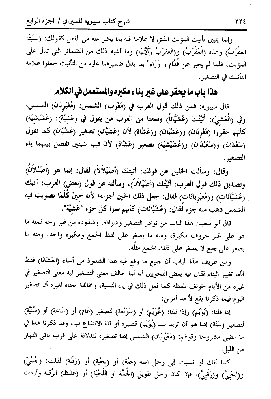 قال سيبويه: فمن ذلك قول العرب في (مغرب) الشمس: (مغيربان) الشمس، وفي (العشيّ): أتيتك (عشيّانا) وسمعنا من العرب من يقول في (عشيّة): (عشيشية) كأنهم حقروا (مغربان) و (عشيان) و (عشّاة) لأن (عشيّان) تصغير (عشيان) كما تقول (سعدان) و (سعيدان) و (عشيشية) تصغير (عشّاة) لأن فيها شينين تفصل بينهما ياء التصغير.