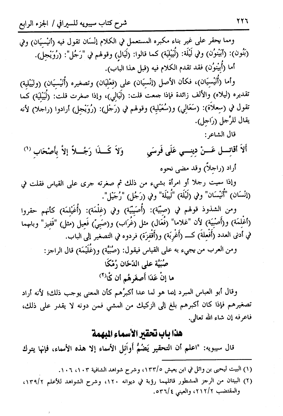 وأما (أنيسيان)، فكأن الأصل (إنسيان) على (فعليان) وتصغيره (أنيسيان) (ولييلية) تقديره (ليلاه) والألف زائدة فإذا جمعت قلت: (ليالي)، وإذا صغرت قلت: (لييلية) كما تقول في (سعلاة): (سعالي) و (سعيلية) وقولهم في (رجل): (رويجل) أرادوا (راجلا) لأنه يقال للرّجل (راجل).