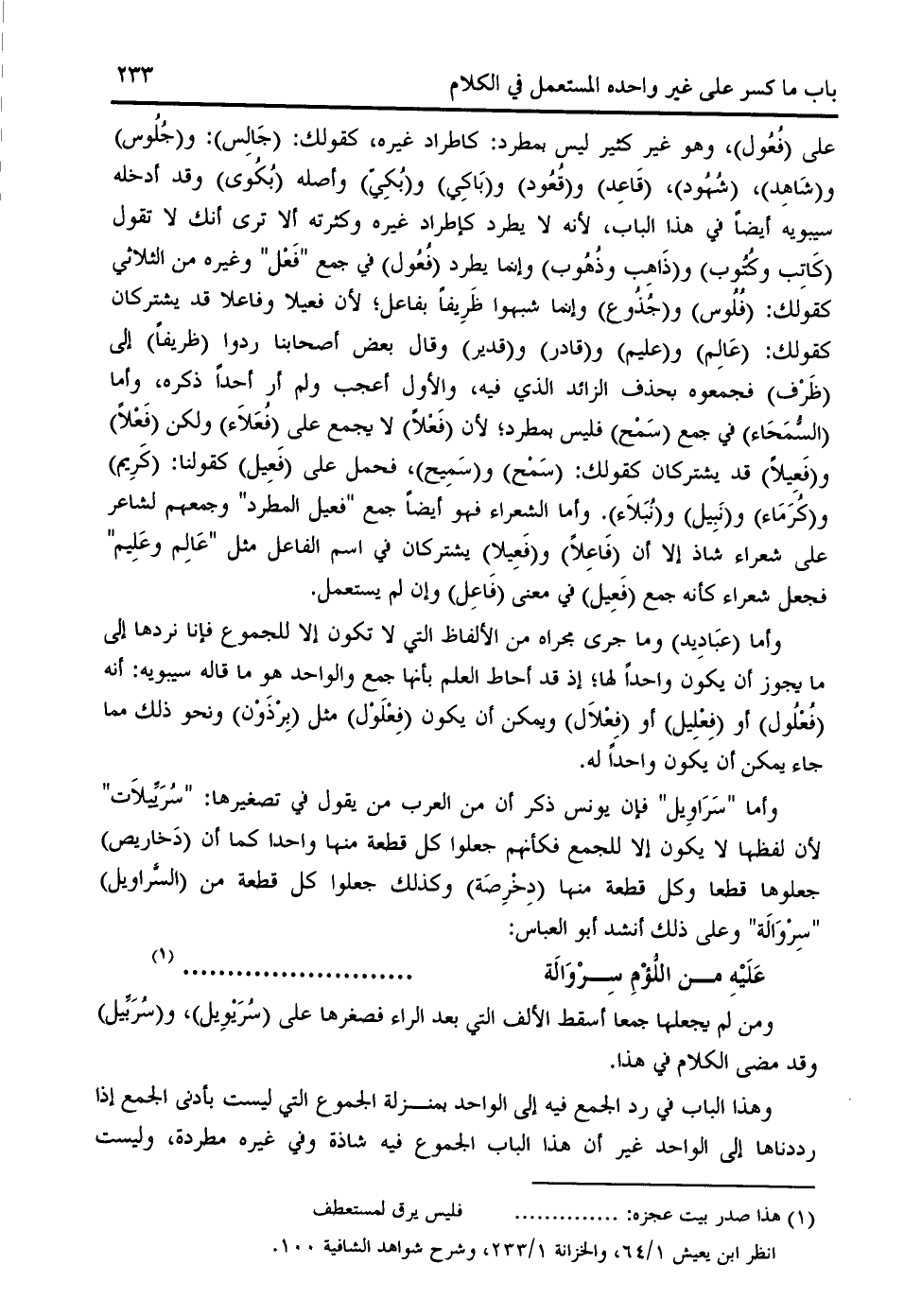 ومن لم يجعلها جمعا أسقط الألف التي بعد الراء فصغرها على (سريويل)، و (سربّيل) وقد مضى الكلام في هذا.