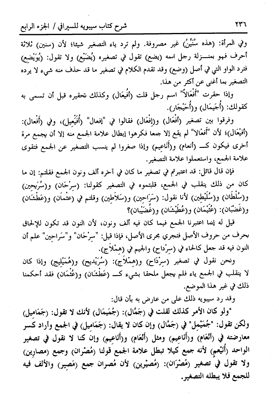 ونحن نقول في تصغير (سرداح) و (هملاج): (سريديح) و (هميليج) وإذا كان لا ينقلب في الجمع ياء فلم يجعل ملحقا بشيء ك (عطشان) و (عثمان) فقد أحكمنا ذلك في غير هذا الموضع.