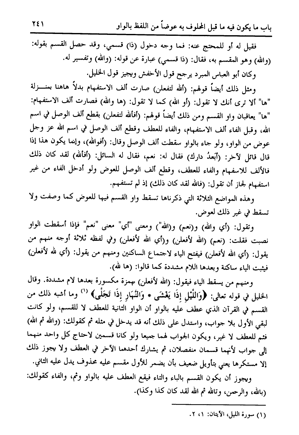 ومنهم من يسقط الياء فيقول: (الله لأفعلن) بهمزة مكسورة بعدها لام مشددة. وقال الخليل في قوله تعالى: وَاللَّيْلِ إِذا يَغْشى * وَالنَّهارِ إِذا تَجَلَّى (¬1) وما أشبه ذلك من القسم في القرآن الذي عطف عليه بالواو أن الواو الثانية للعطف لا للقسم، ولو كانت لبقي الأول بلا جواب، واستدل على ذلك أنه قد يدخل في مثله ثم كقولك: (والله ثم الله) فثم للعطف لا غير، ويكون الجواب لهما جميعا ولو كانا قسمين لاحتاج كل واحد منهما إلى جواب لأنهما قسمان