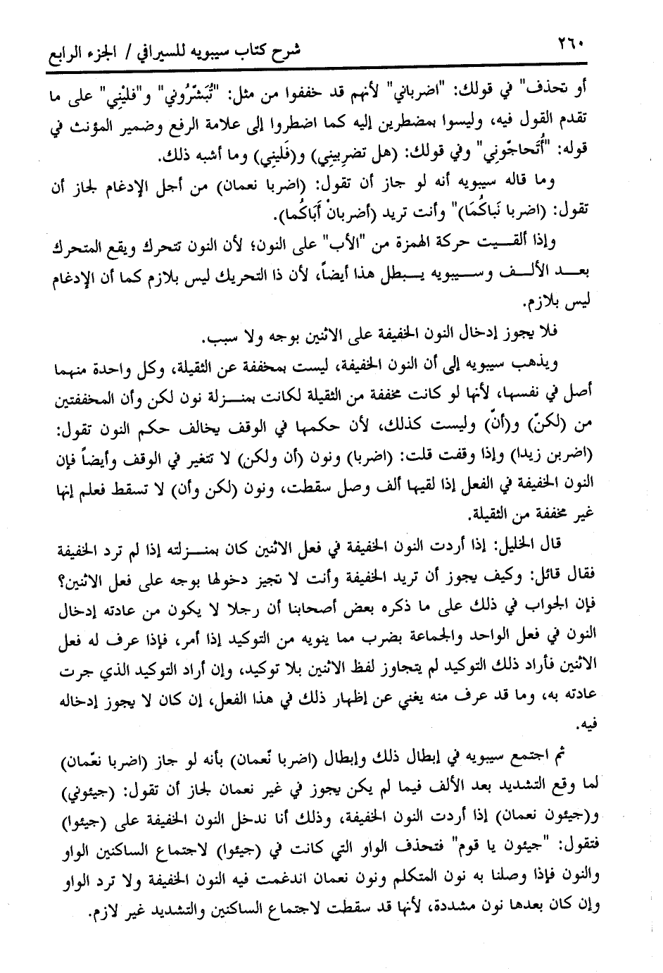 وما قاله سيبويه أنه لو جاز أن تقول: (اضربا نعمان) من أجل الإدغام لجاز أن تقول: (اضربا نباكما) " وأنت تريد (أضربان أباكما).