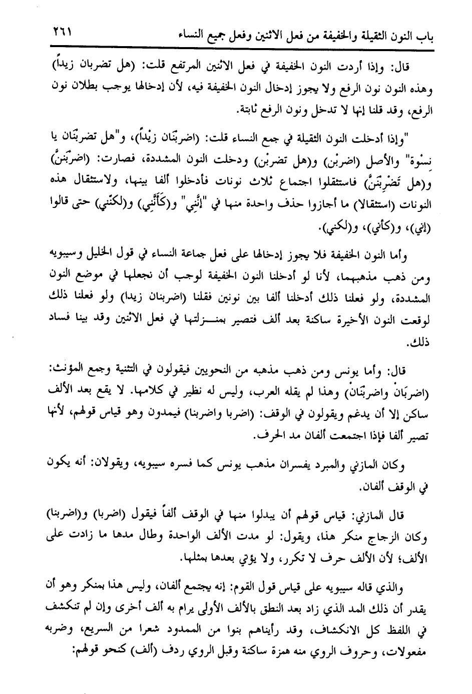 " وإذا أدخلت النون الثقيلة في جمع النساء قلت: (اضربنان زيدا)، و " هل تضربنان يا نسوة " والأصل (اضربن) و (هل تضربن) ودخلت النون المشددة، فصارت: (اضربننّ) و (هل تضربننّ) فاستثقلوا اجتماع ثلاث نونات فأدخلوا ألفا بينها، ولاستثقال هذه النونات (استثقالا) ما أجازوا حذف واحدة منها في " إنّني " و (كأنّني) و (لكنّني) حتى قالوا (إني)، و (كأني)، و (لكني).