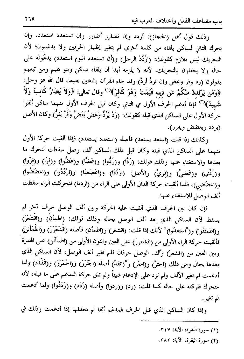 وذلك قول أهل (الحجاز): أردد وإن تضارر أضارر وإن تستعدد استعدد. وإن تحرك الثاني لساكن يلقاه من كلمة أخرى لم يتغير إظهار الحرفين ولا يدغمون؛ لأن التحريك ليس بلازم كقولك: (اردد الرجل) و (أن تستعدد اليوم استعدد) يدعونه على حاله ولا يحفلون بالتحريك، لأنه لا يلزمه أبدا أن يلقاه ساكن وبنو تميم ومن تبعهم يقولون (رد وفر وعض وإن تردّ أردّ) وقد جاء القرآن باللغتين جميعا، قال الله عز وجل: