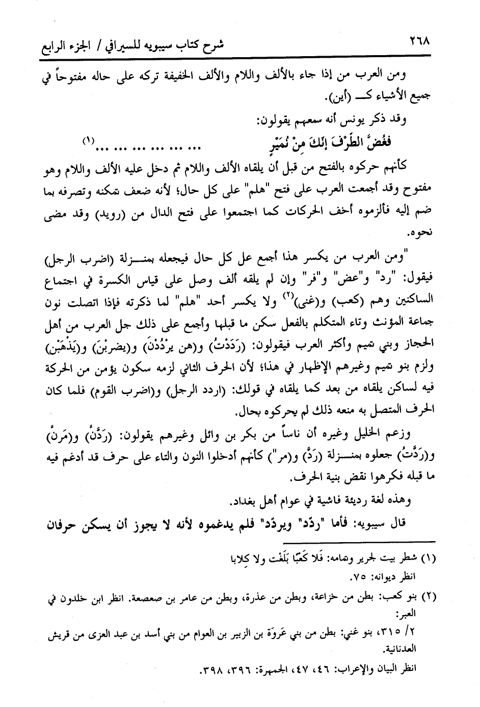 وزعم الخليل وغيره أن ناسا من بكر بن وائل وغيرهم يقولون: (ردّنّ) و (مرنّ) و (ردّت) جعلوه بمنزلة (ردّ) و (مر ") كأنهم أدخلوا النون والتاء على حرف قد أدغم فيه ما قبله فكرهوا نقض بنية الحرف.
