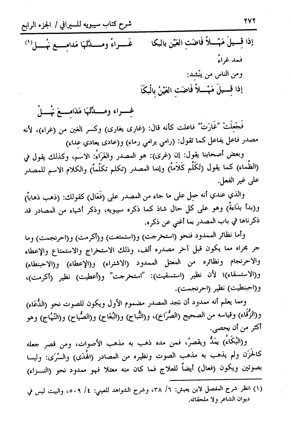و (البكاء) يمدّ ويقصر، فمن مده ذهب به مذهب الأصوات، ومن قصر جعله كالحزن ولم يذهب به مذهب الصوت ونظيره من المصادر (الهدى) والسّرى: وليسا بصوتين ويكون (فعال) أيضا للعلاج فما كان منه معتلا فهو ممدود نحو (النزاء)